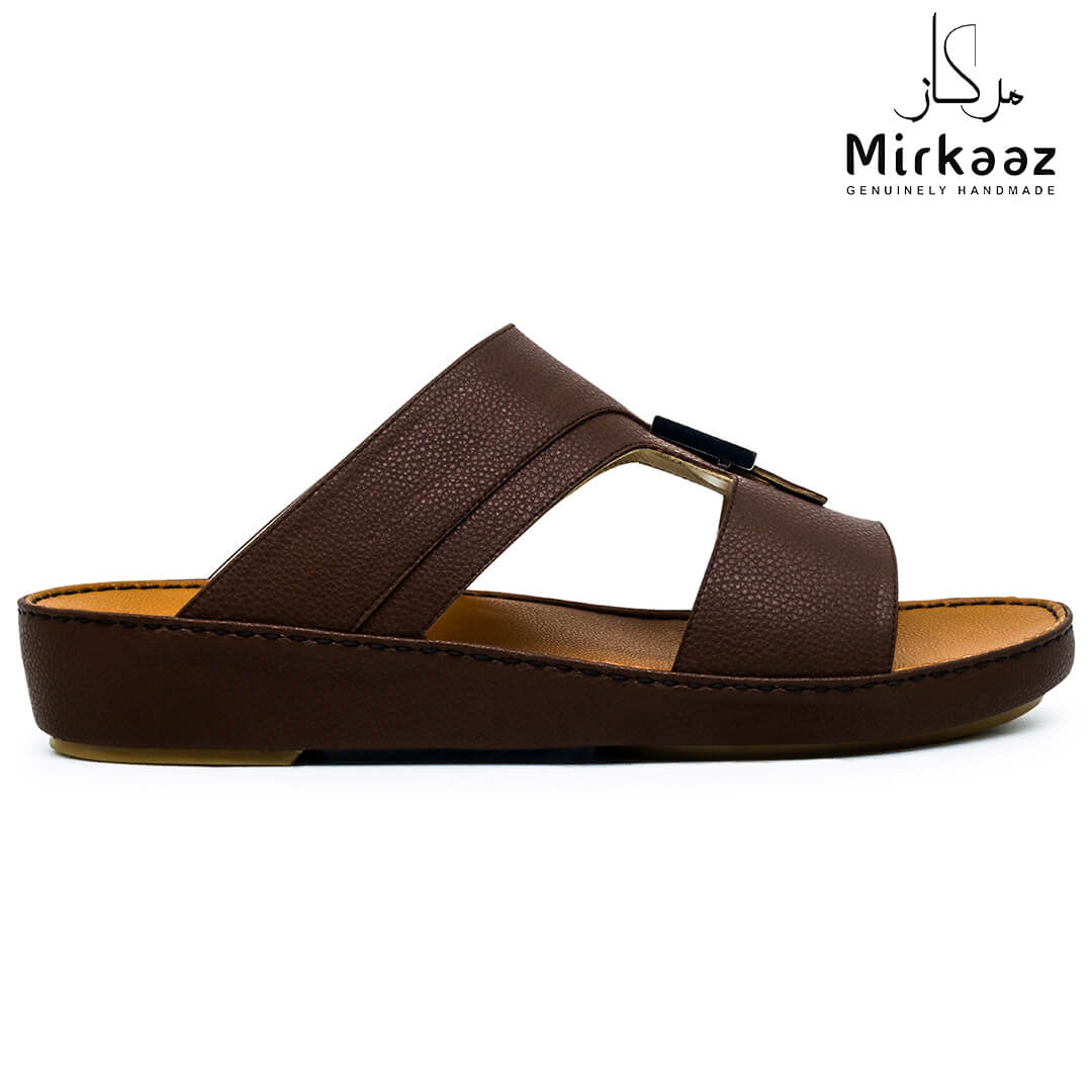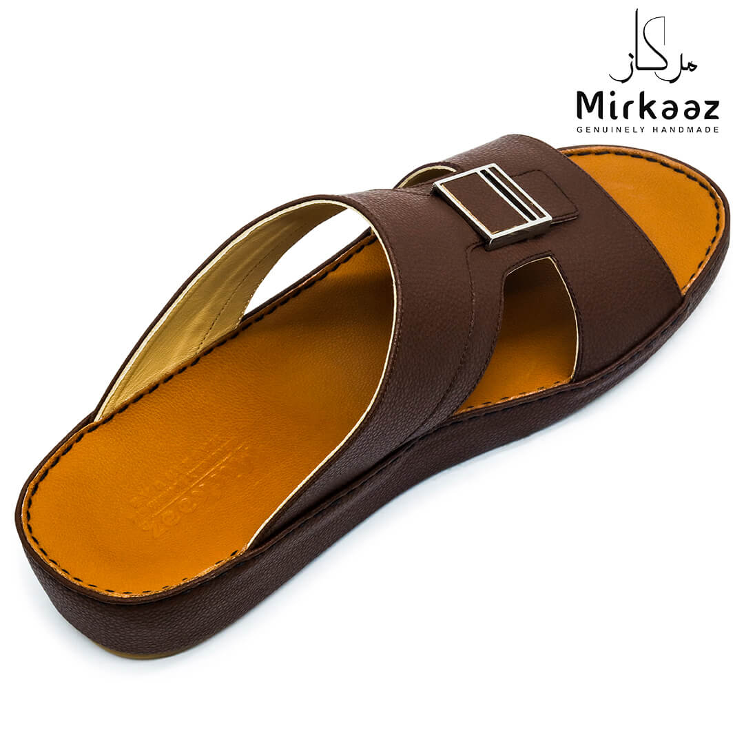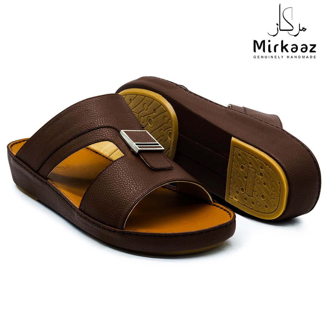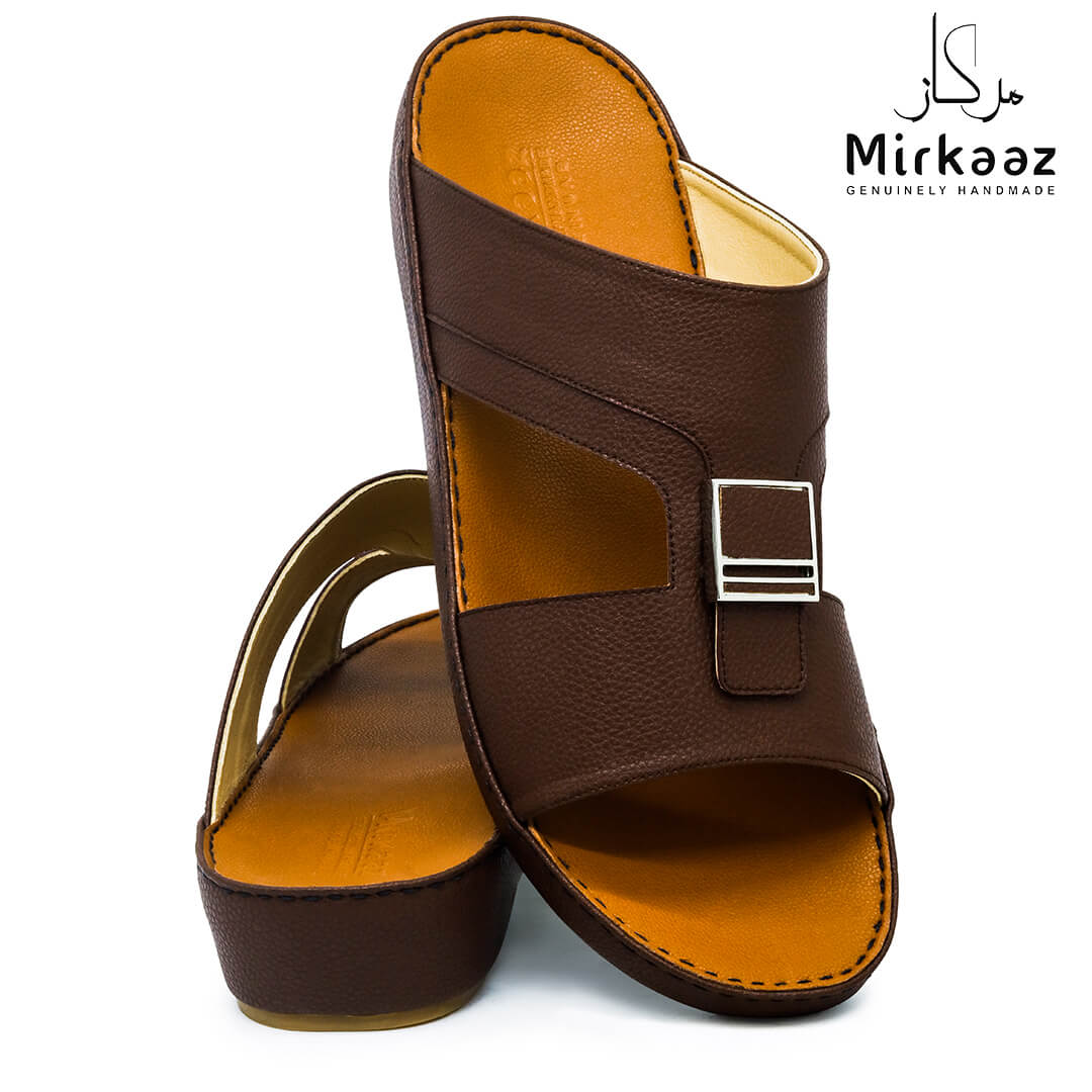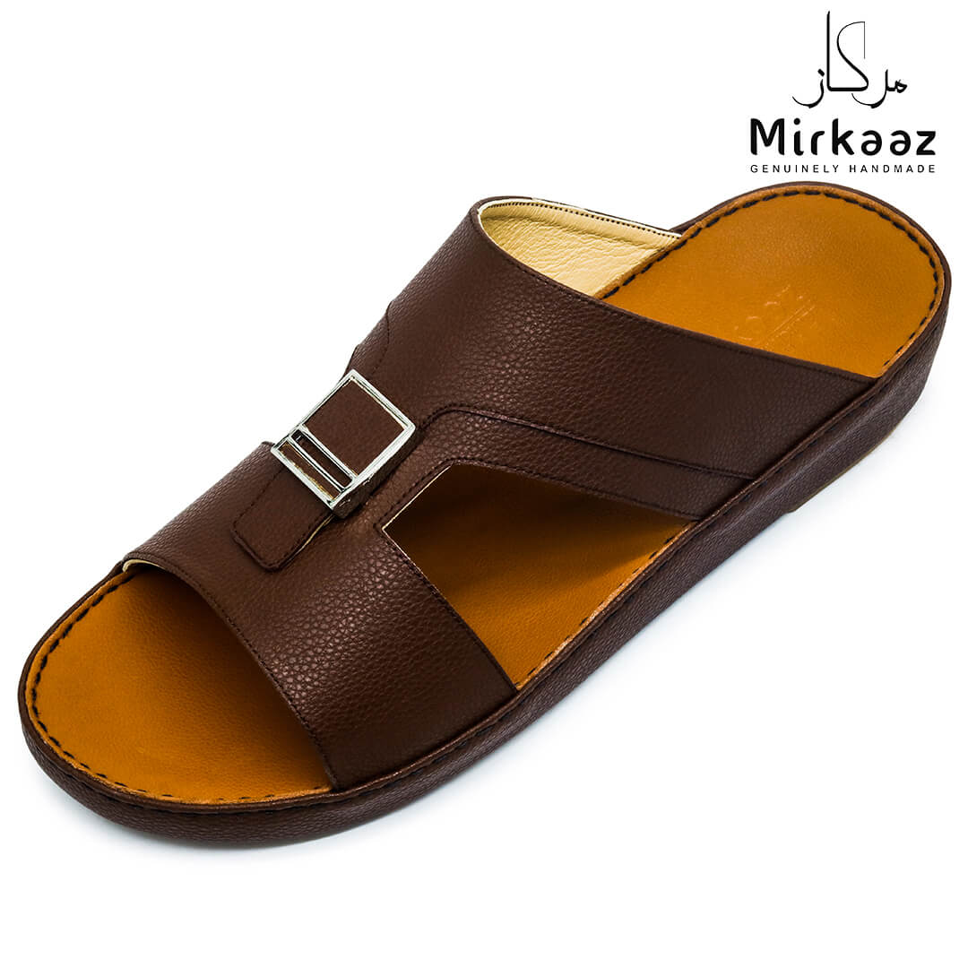 حافظ على راحة وسلامة قدميك من خلال صنادل الجلد المميزة من دار ميركاز في الإمارات العربية المتحدة. فهذا الصندل الغني بالنقوش مثالي لجميع المناسبات. صندل مصنوع من مواد عالية الجودة تتميز بخفة وزنها ومستوى أمانها العالي بفضل النعل "المقاوم للانزلاق". كما أن هذا الصندل الجلدي مصمم ليتحمل الاستعمال لفترة طويلة وتمت صناعته بواسطة متخصصين محترفين في الإمارات. فإذا كنت تريد أن تمشي بكل راحة وأناقة فلا تتردد في اقتناء هذا الصندل. هذا النعل مصنوع من الداخل من مواد عالية الجودة من البولي يوريثان الذي يتميز بالخفة والمتانة. تمت حياكته يدويًا باستخدام خيط مضفر قوي وتدوم الحياكة لفترة طويلة جدًا. تمنع بطانة النعل الداخلية المصنوعة من مواد عديمة الرائحة تراكم أي نوع من الروائح على سطحها مما يجعلها دائمًا نظيفة حتى بعد الاستخدام الطويل. يوفر المصنع ضمان 6 أشهر للحياكة والنعال